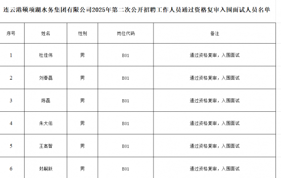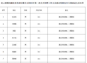 一、通过资格复审入围面试人员名单公布 根据《连云港硕项湖水务集团有限公司2025年第二次